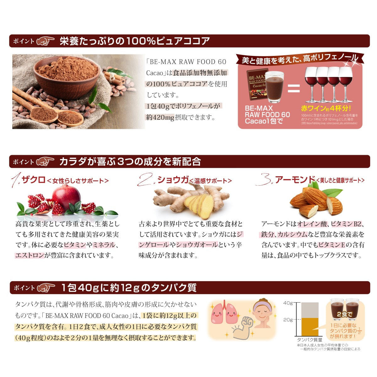 厳選された穀物・野菜・果物に、たんぱく質&ポリフェノールたっぷりの100%ピュアカカオをはじめ、植物性乳酸菌、MCTオイルや7種のベリーなど60種類以上の食材をブレンド。
