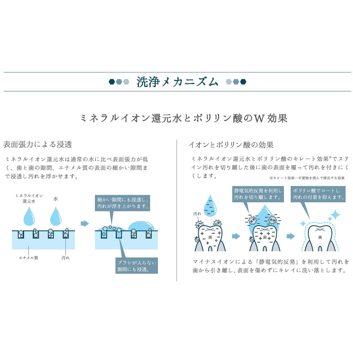 独自のミネラルバランスでイオン化した高アルカリ性のイオン水が口腔内環境を整えます。